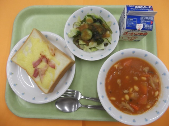 ベーコンチーズトースト 鶏肉のトマト煮 海藻サラダ 牛乳