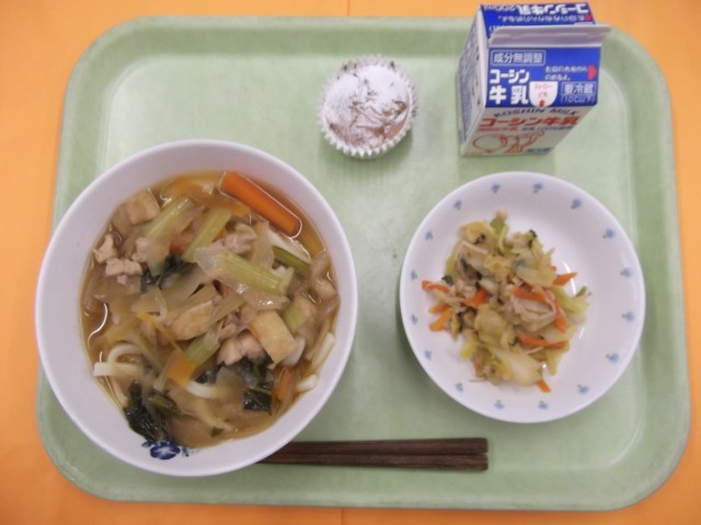 五目うどん おひたし アップルチーズケーキ 牛乳
