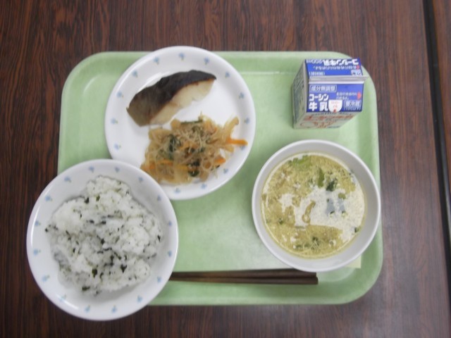 わかめご飯 魚の西京焼き 大根と春雨の炒め物 かきたま汁 牛乳