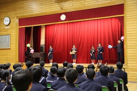4月13日に、新入生向けの部活動説明会を行いました。各部活動の代表者が、限られた時間の中で工夫を凝らしながら、活動内容や部の魅力を紹介しました。新入生は、先輩による実演を交えた説明を食い入るように見つめ、どの部活動に参加しようか真剣に考えている様子でした。中学校生活をより充実したものにするためにも、自分に合った部活動を選び、全力で取り組んでくれることを期待しています。