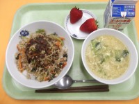 えびクリームライス 茎わかめサラダ さくらんぼ 牛乳