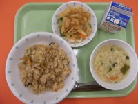 麦ごはん 魚のごまみそがけ 辛子煮びたし 吉野汁 牛乳