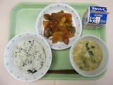 わかめごはん 酢豚 コーンと卵の中華スープ 牛乳
