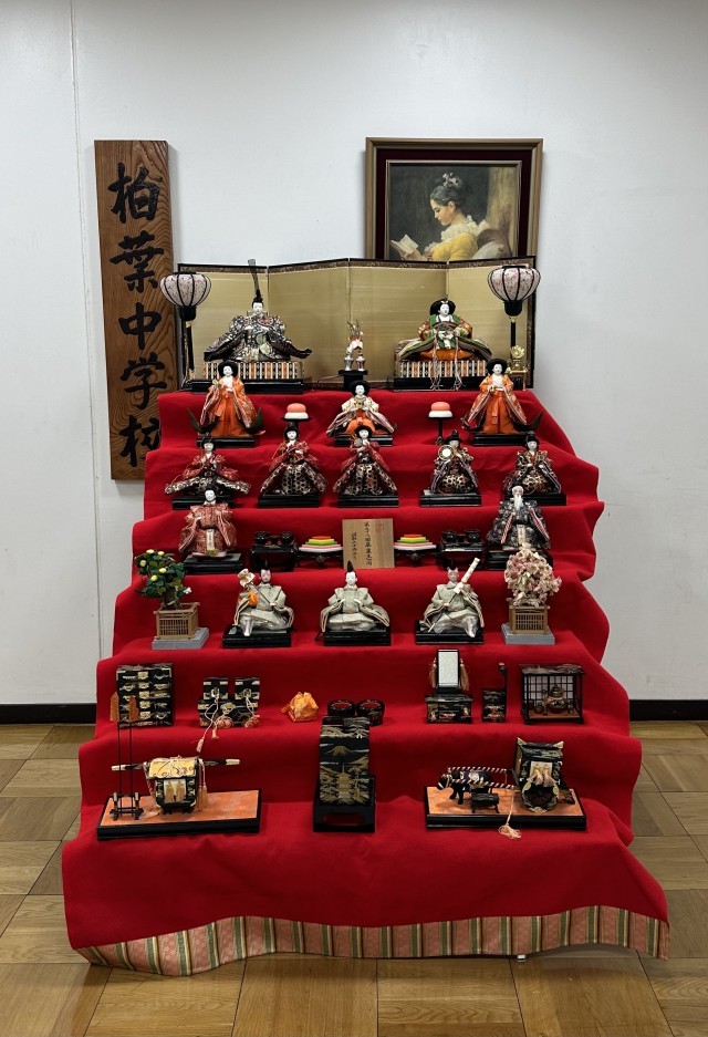 先日まで、本校の職員玄関の入口に雛人形が飾られていました。これは、柏葉中学校に長く受け継がれてきた伝統の一つで、毎年この時期になると飾られ、来校された方々や登校してくる生徒たちを温かく迎えてくれます。玄関に入ると、華やかな装いの雛人形が並び、校内に季節の彩りを添えていました。足を止めて眺める生徒の姿も見られ、「きれいだね」と友達同士で話す様子もありました。雛人形には、子どもたちの健やかな成長や幸せを願う思いが込められています。本校でも、生徒一人一人の成長を願いながら、大切に飾られてきました。これからも、このような季節の伝統を大切にしながら、学校生活の中で日本の文化や行事に親しむ機会を大切にしていきたいと思います。