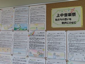 本日授業を参観してみると、数学の少人数授業では、比例を学んでいました。二つの図形の比をから、数値を求めていました。校庭ではソフトボールのバッティング練習をしています。上手にトスを投げると打ち返せるようです。とても楽しそうに行っていました!3年生のフロアには、一人一人の上中音楽際への意気込みが書かれた掲示物が貼られていました。自分の目標やそれを実現するための方策や考えなどが書かれています。当日、3年生中心に頑張ってくれることを期待してます!