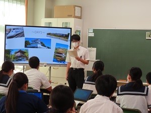気持ちよく晴れた青空!心が弾みます。今日は何か良いことがあるような気がします。3年生の英語では、修学旅行の思い出をプレゼンしています。懐かしいですね。1年生は体育でバレーボールの授業です。グループで作戦を練っているようです。今度入れてください!