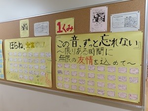 本日は朝から冷たい雨。学校に来るときの服装を大変に迷いました。生徒のみなさん、風邪引かないでくださいね。3年生のフロアでは、「各クラスの合唱への意気込み」が掲示されています。練習にも力が入っています。仕上がりが楽しみです。理科では、物が落下するときの重力の実験でしょうか?ぶつかってどれくらい移動するか、試していました。楽しそうにおこなっているのが印象的でした。