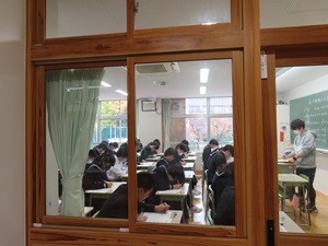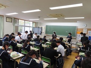 本日校庭にて、登校してくる生徒に挨拶にいきました。きれいな紅葉ですが、とても寒そうな空模様です。マフラーをしてくる生徒もいました。教室では、期末考査二日目です。真剣に受けている様子が、外まで伝わってきます。そのような中、お待ちかねの給食の時間になりました。食べることはとても大切で、楽しみにもなります。生徒のみなさん、明日も頑張ってください。応援してます!