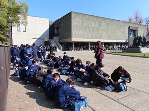 国立西洋美術館が世界遺産になって早いもので10年がたちます。当時は、世界遺産になったお祝い事が沢山ありました。上野公園にて夕方より開会のセレモニーがあり、上野中学校吹奏楽部が演奏しました。また、翌日には花びら(生花)を使って地面に模様を描く「インフィオラータ」というものを作成するボランティアに上中生は参加しました。なんと言っても、「世界遺産 国立西洋美術館」は上野中学校の学区域ですから!本日は「学びのキャンパスプラン事業」により、西洋美術館に行きました。なんと言っても歩いて行けるのが魅力です。生徒たちも学びを深めることが出来ました。館内の写真撮影可の場所で、担当者の確認を取り、生徒たちの学習の様子を掲載させて頂きます。