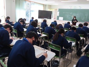 本日授業参観をしていると、4階音楽室から何やら音が聞こえてきます。1年生の作曲で、CMに合わせた曲作りをしていました。数名で相談したり、紹介しあったりしていて楽しそうです。2年生の英語では、単語の読みや意味をペアになり、確認していました。お互いに学び合う姿が印象的です。3年生の数学は、答案用紙にマークシートが使われていました。本番を想定した問題練習でしょうか。明日は立志式!生徒のみなさん、「こころざし高く」頑張りましょう!