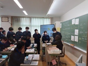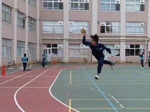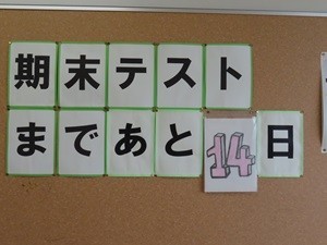 校庭でハンドボールのジャンプシュートの練習をしていました。躍動的なジャンプです。その昔、私もハンドボールをやっていました。その名残で、校庭にもハンドのコートが書かれています。2年生は英語のテストでしょうか。先生をはさんで行列になっています。1年生の廊下には「期末考査まであと何日」の掲示板。今日はまだ、書き換えられていないようですね。