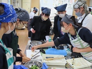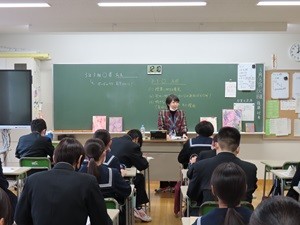 本日は肌寒いですね。1階の廊下を歩いていると、なにやら美味しそうなにおいがします。そちらに行ってみると家庭科室で調理実習をしていました。落とし蓋をしている中身は「さばの味噌煮」でした。ネギも長く切ってあって美味しそうです。また、班の中で仲良く役割分担をしているのが微笑ましいです。そういえば、移動教室で飯ごう炊さんを経験したのですね。出来上がりが楽しみです。3年生の教室では、各教科で最後の授業がおこなわれています。ちょっと寂しくもなります。
