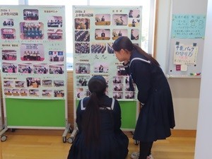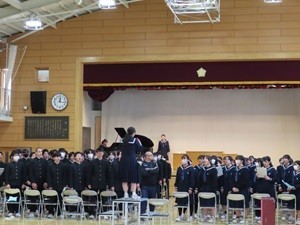 今週から3年生の式練習が始まります。卒業式に向けて、礼法や流れ、式歌の練習をします。4時間目に歌練習をしているところを参観しました。とても上手に歌っています。さらに、仕上げてくるのが楽しみです。給食後に、校長室前の写真を3年生が見入っています。このように見えてもらえると、やりがいがあります。本日も昼休みに校庭で遊ぶ生徒が沢山いました。