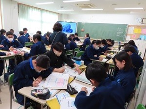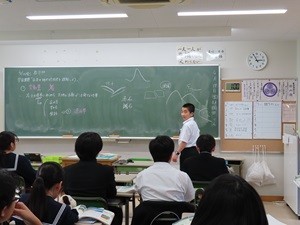本日は朝から気持ちよく晴れています。天気がいいと、心も晴れてくるから不思議です。3年生の英語は、グループになり問題を解いていました。お互いに教え合っていて、良い雰囲気でした。2年生は社会で「川の出来る要素」を説明している場面でしょうか。クラス全体が発表者を暖かく見守っている様子がよく伝わってきます。明日は、土曜授業です。