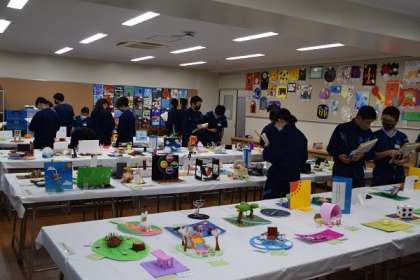 16日から開催しているミニ作品展が今日で終了します。美術室では「あったらいいな こんなイス」(3年生)、「オノマトペ」(2年生)、アイデア帳(3年生)、美術部作品が展示してあり、美術の授業の中で鑑賞をしていました。いずれの作品も様々な工夫が施されており、とても見応えがありました。