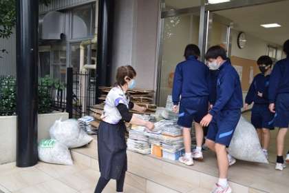 今朝は、生徒玄関で生徒会役員による空きカン・紙パック・エコキャップの回収(写真左)、校庭の正門で生活委員による挨拶運動(写真中央)、教師用玄関で整美委員による資源ゴミ出し作業(写真右)が行われ、生徒たちの元気な姿と声が行き交っていました。とても良い雰囲気です。おかげで、私(校長)も一段と大きな声で登校してくる生徒たちと挨拶を交わしました。朝からとても爽やかな気分です。