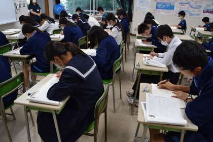 今日は、秋晴れで爽やかな一日でした。学校では、今日もいろんなことが行われています。写真左は、第2学年の整美委員が生徒たちの登校前に生徒用玄関や体育館棟を清掃してくれているところです。写真中央は、私が10時からオンラインで連合校園長会に参加しているところです。写真右は、放課後、校内で漢字検定を実施しているところです。27名が受検していました。来週も、楽しい学校生活が待ち受けています。皆さん、良い週末をお過ごしくださいね!
