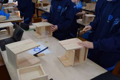 1校時、第1学年の技術では、CDラックを製作するにあたり、くぎ打ち、接合するときに大切にしたいポイントを個人やグループで考え、それをもとに実際にくぎ打ち作業を行っていました。今日は、大学の先生や他校の先生を含め13名の参観者がいましたが、生徒たちは緊張することもなく、友達と助け合って上手に作業を進めていました。これで、家でも日曜大工ができるようになるね!