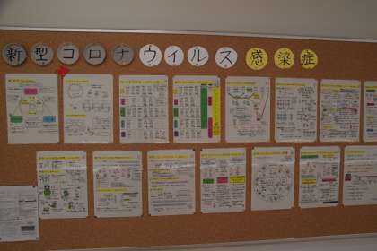 写真は保健室前の廊下の掲示物です。来週から生徒の皆さんが登校したときに、新型コロナウイルス感染症に対応するために参考となる資料を、保健室の先生がわかりやすくまとめて掲示してくれました。着々と来週からの準備が整っています。