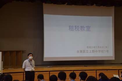 写真は昨日の6時間目に1年生で実施した租税教室の模様です。講師は上野税務署の方をお招きしました。税の使い道や集め方、公共サービスと税負担の相互関係など、詳細なお話をしていただきました。今年も全学年で夏季休業期間中の宿題に「税の作文」を書いてもらいますが、1年生は租税教室のお話も参考にして、税についての各自の思いをまとめてもらいたいと思います。頑張って!