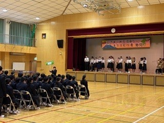 それから、2,3年生による校歌紹介があり、2,3年生全員で1年生に向けて校歌を歌いました。