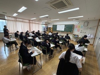 第1,2学年は、1校時から5校時までで国語、社会、数学、理科、英語の5教科を行い、6校時に意識調査を行いました。