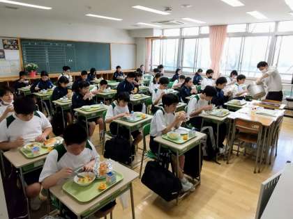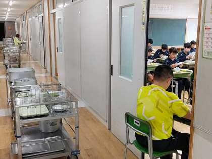 「いただきます!」をして、皆さん、食事中でした。学級担任の先生が「ポトフ」の入った食缶を持って回っています。これで、本日も食缶は空っぽです。