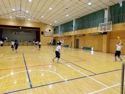 3階、体育館です。「男女バレーボール部」の皆さんが朝練習を行っていました。今日は放課後に先生たちの研修会があるため、45分授業となっていて、放課後の部活動は基本的にありません。