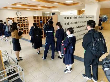 昇降口です。7:50のチャイムが鳴って、生徒の皆さんが校舎内に入っていきます。