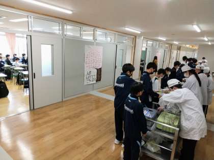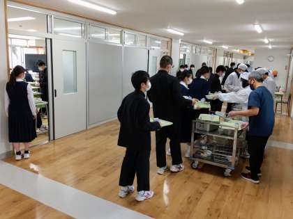 4階、1年生のフロアです。こちらは配膳が始まったばかりというところでしょうか。でも、少しずつ手順などが分かり、皆さん慣れてきている感じですね。