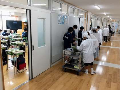 4時間目が終了し、給食の準備が始まりました。45分授業なので、いつもよりちょっと早めの給食です。