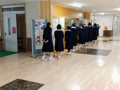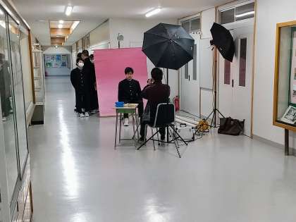 第1学期(第2週):4日目です!その5 公開日 2022/04/14 更新日 2022/04/14 できごと ■4月14日(木) 1階、被服室前の廊下です。 「個人写真撮影」が始まりました。3年生から順に撮影していきます。撮影の時だけマスクを外してパチリ! もう1ヶ所の撮影場所は会議室です。 廊下に並んで順番を待ち、1人ずつ部屋に入って撮影します。 3年生の皆さんは、12月になると「受験用写真」も同じように撮影することになります。