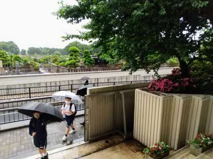 天気予報どおり、朝から雨でしたね。生徒の皆さんも傘をさしての登校でした。