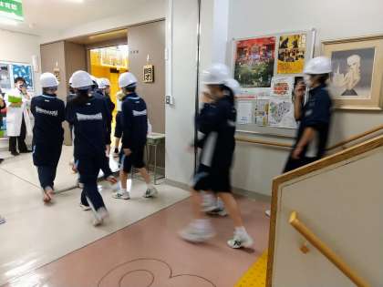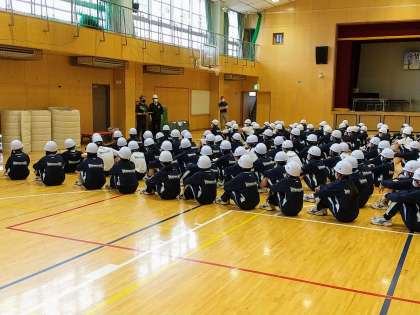 密を避けるために、1年生と2年生を対象に実施しました。ヘルメットを被り、煙を吸わないようにハンカチを用いての避難です。