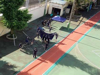 こちらは校庭です。「体育大会実行委員会」「生活委員」の皆さんが、テントを張っています。「体育大会」の当日は、リバーサイド陸上競技場にも、これと同じテントを張って「生徒席」とします。