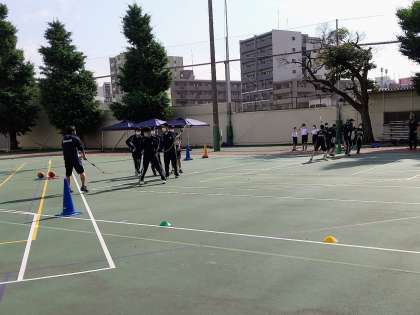こちらは2年生です。間に少しだけ隙間のある2枚の板の上にボールを載せて、落とさないように運ぶという「学年種目」です。ちょっとだけ進行方向に傾けながら走ると上手くいきそうですね。