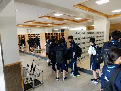 さて、昇降口です。7:50のチャイムが鳴り、生徒の皆さんが校舎内に入っていきました。