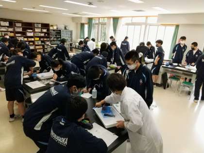 こちらも3年生の皆さんです。塩酸に「銅板」「亜鉛板」を入れての実験です。さて、どのような変化が起きるのでしょうか?