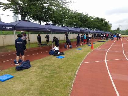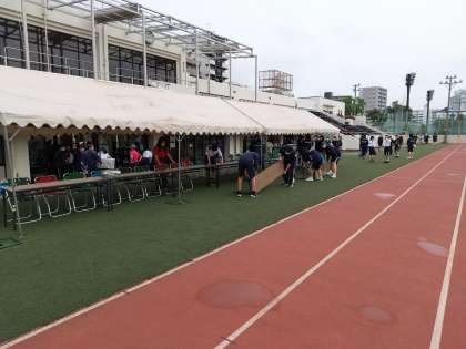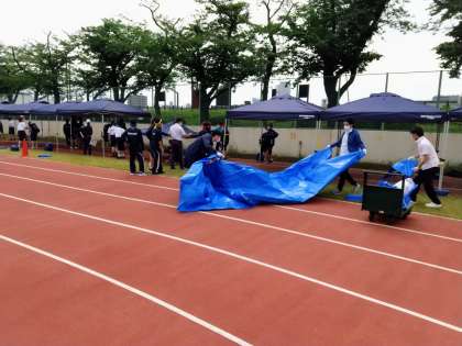 まずは、朝の準備です。リバーサイド陸上競技場の方が予定時刻よりも早く入場させてくださったので、本部テントの設営は既に終了。長机とイスをセッチングしたら終わりです!