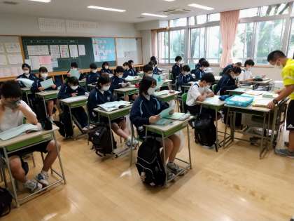 皆さん、先生から配られた「水色のプリント」を読んでいますね。ちょっと覗いてみたところ、他の学年から「霧ヶ峰移動教室」に「応援」で参加する先生からのメッセージでした。さて、どのようなことが書かれているのでしょう・・・。