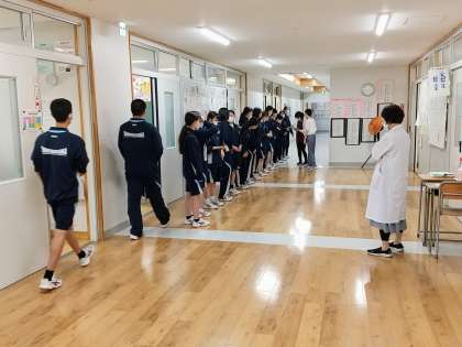2階、3年生のフロアでは、「朝の手洗い」に加えて、「身なり確認」が行われていました。そう言えば、昨日、忘れないようにとマジックで「手」に書いていた生徒は大丈夫だったでしょうかねぇ?