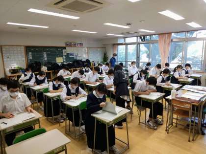 皆さん、一斉に「解答用紙」に「クラス・番号・氏名」を記入。そして、すぐに放送が入りました。