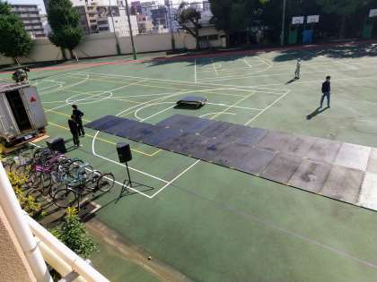 そうです。「リスニングテスト」です。放送室のドアの上のランプが点灯しています。 都立高校の入試でも最初の10分間で行われるリスニングテスト。頑張ってください! そして、校庭では「スケアード・ストレイト」の準備が始まっています。自転車も並んでいますね。以前、見たことがありますが、とても迫力のあるスタントだったのを覚えています。