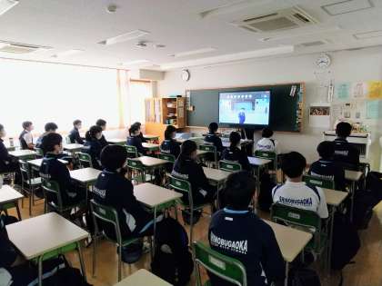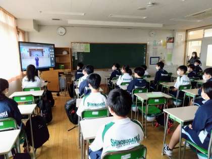 いつもの「生徒会朝礼」と同様に、オンラインで各教室を結んでの形です。2階、3階の教室の様子はこのような感じです。皆さん、しっかりと話を聞いていました。