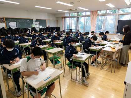 ちょうど今、テスト開始のチャイムが鳴りました。皆さん、まずは一斉に解答用紙に「クラス」「出席番号」「氏名」を記入します。