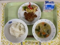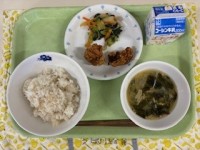 ●牛乳●麦入りごはん●鶏肉のから揚げ●小松菜とちくわの炒め物●じゃがいものみそ汁