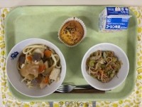<冬至メニュー>●牛乳●けんちんうどん●焼肉サラダ●かぼちゃケーキ