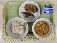 ●牛乳●麦入りごはん●魚のスタミナソース●白滝と大豆もやしのナムル●チゲスープ