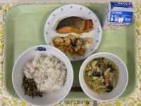 ●牛乳●麦入りごはん/桜えびのふりかけ●鮭のカレー醤油焼き●高野豆腐の卵とじ●ご...