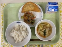 ●牛乳●麦入りごはん●ジャンボ揚げ餃子●白滝と大豆もやしのナムル●じゃがいもの中...